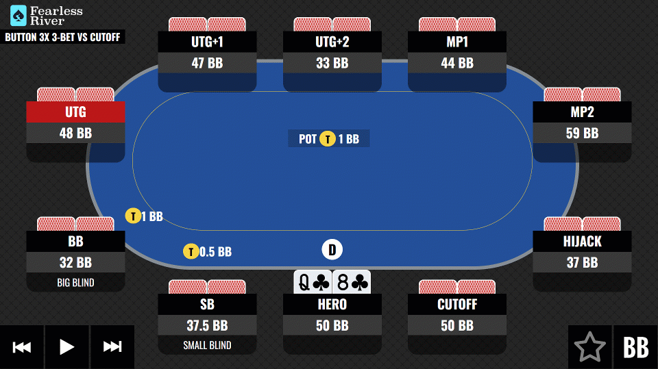 | MTT | MP2 Open Vs Button 3x 3-Bet 8-Handed | 33.1 BBs |